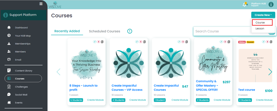 1. From your Dashboard, go to Courses and select ‘Create New' and select 'Course'.