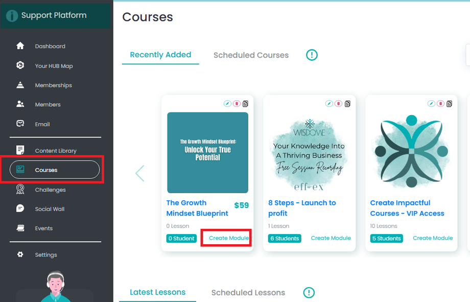 1. Go to 'Courses', select your course, then click 'Create Module' to get started.