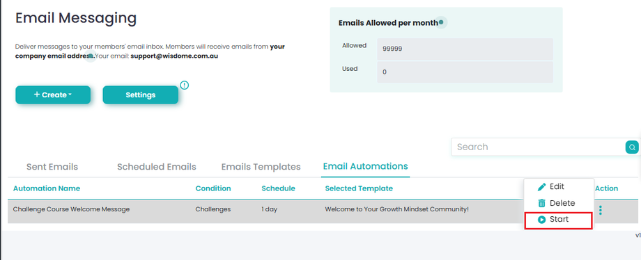 Select ‘Start’ to activate your email automation. Once completed, a confirmation message 'Email Automation Started Successfully' will be displayed on your screen.