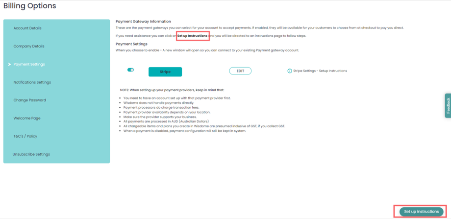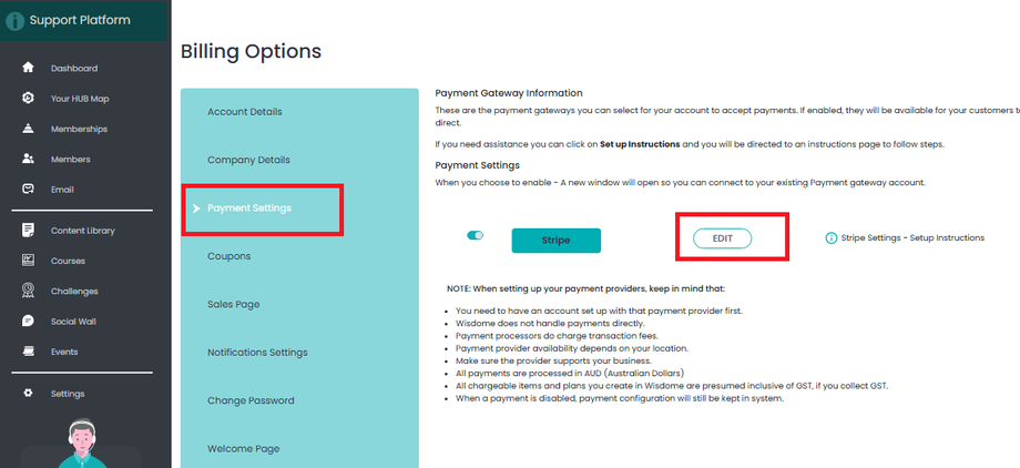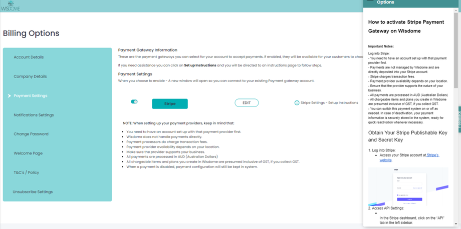 Below we show you where you can find help and directions to integrating STRIPE inside WISDOME.