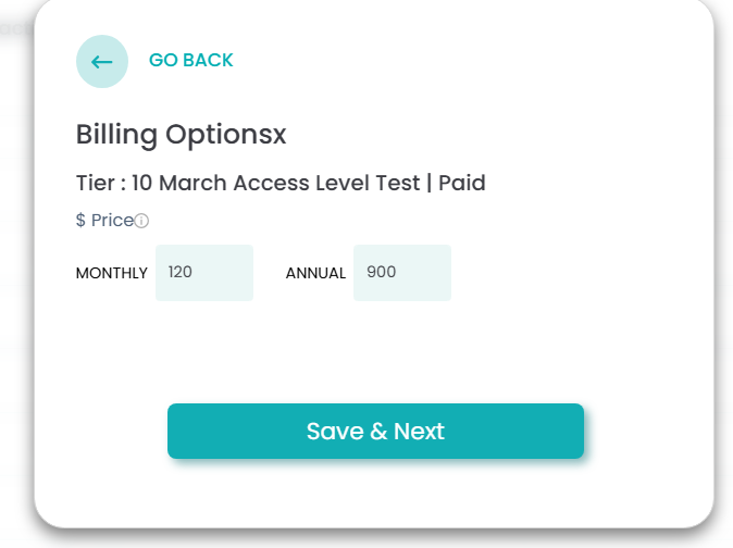 7. Enter the amounts for your membership fees (both monthly and annual). Click 'Save & Next."