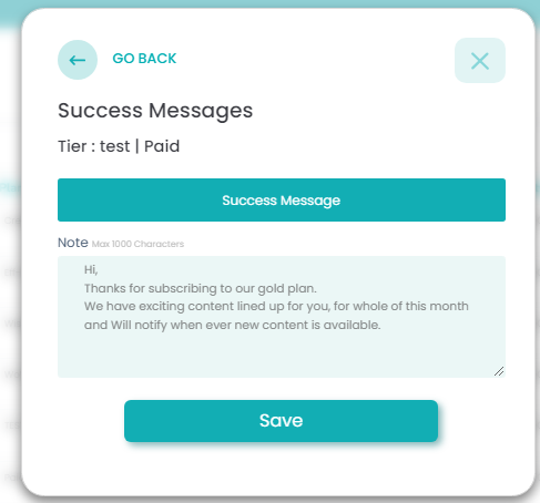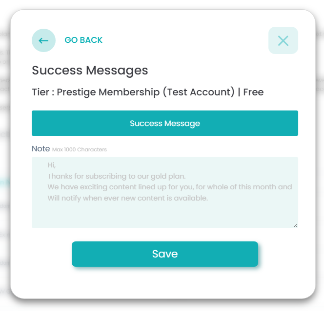 Click "Save & Next" then add your success message. This will be sent to your members after they have successfully registered for your membership plan.