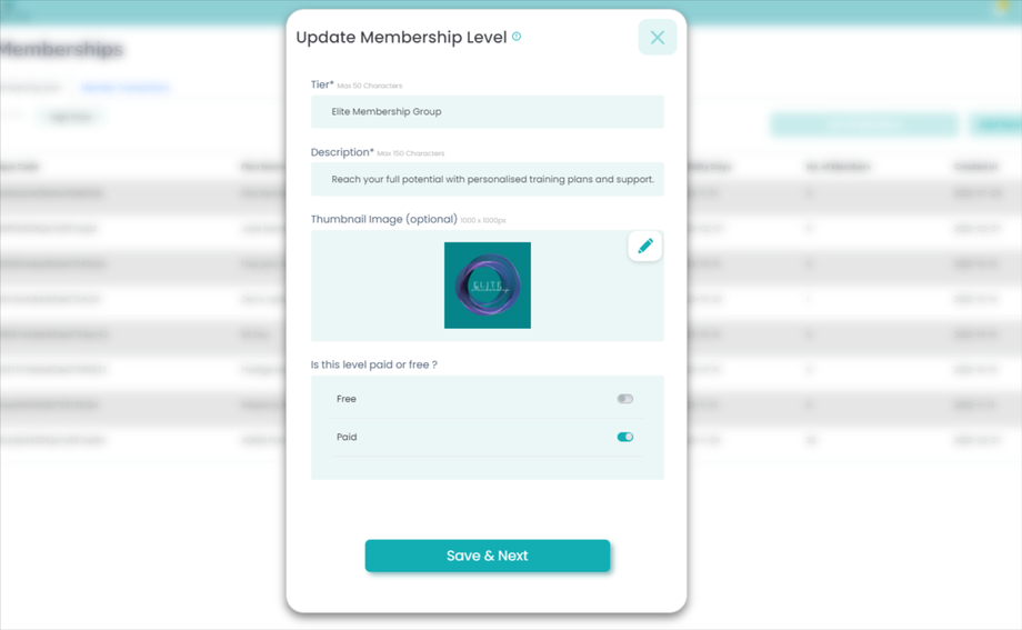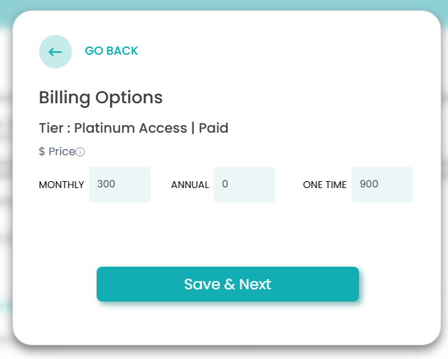 3.3. Once done adding the prices of your membership access level, click 'Save & Next.'