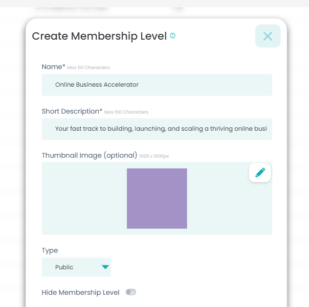 - Type: Select 'Public' if this access level is for everyone who registers to your hub and 'Private' if it's for specific individuals.
