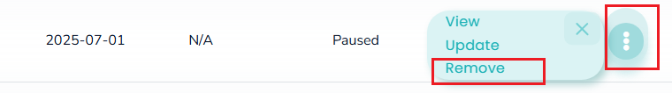 5. Click the More Options menu (⋮) under the ‘Action’ column beside the ‘Active/Paused’ column. Then, click 'Remove.'