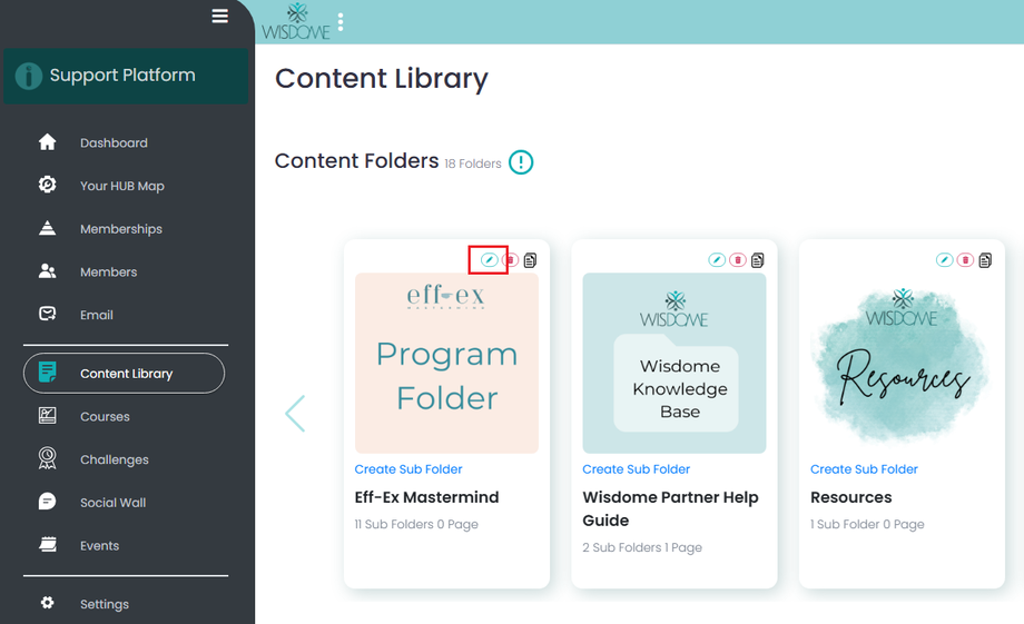 Go to the specific content folder, course, challenge, or social wall you want to hide. Then, click the edit icon at the top right corner.