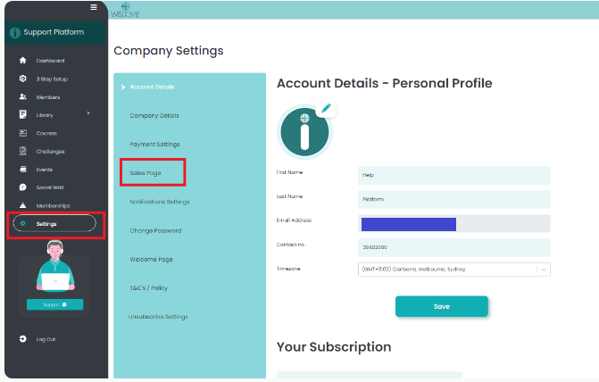 1. Go to ‘Settings’ and select ‘Sales Page.’