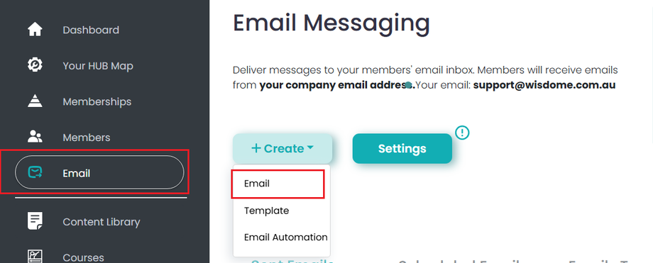 From the dashboard side menu, select 'Email.' Click + 'Create' and select 'Email' from the drop-down menu.
