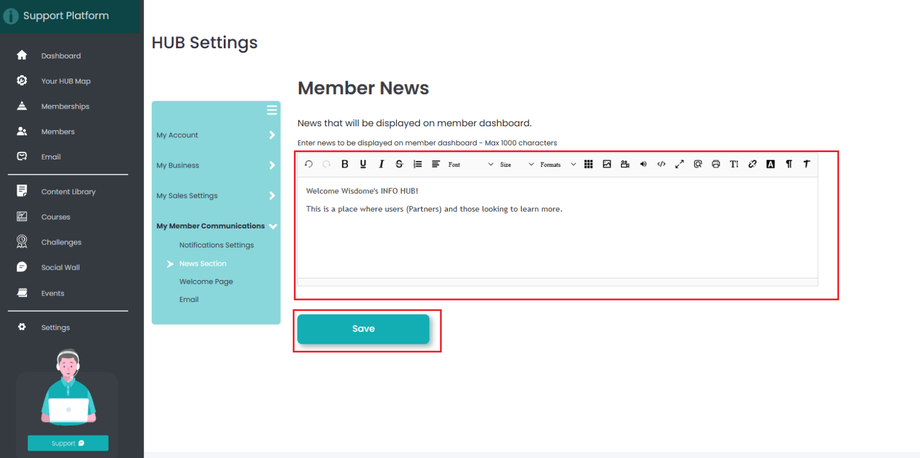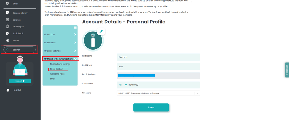 How to Set Up News a Announcement For Your Members The Process: Select 'Settings' then 'My Member Communications' and choose 'News Section.' 2. Add your message and click 'Save.' 3. A confirmation message 'News Section Updated Successfully' once your message is saved.
