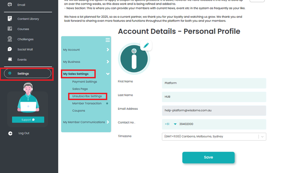 5. Click 'Save' to update your new information. Note: You will see a confirmation message 'Updated Successfully" once your message is saved in the system.