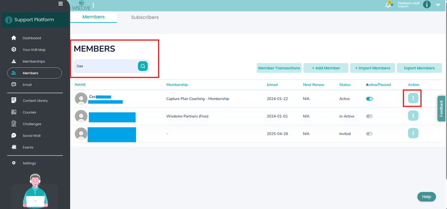 3. Search for the member’s name using the search bar. Then, click the ‘More Options’ menu (three dots) beside the member’s details.