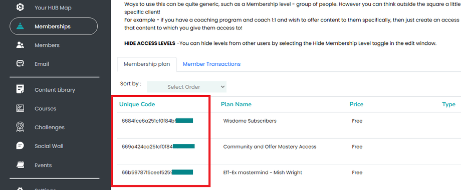 Membership level (Enter your access level's "Unique Code" associated with the membership access level you've created in Wisdome.)