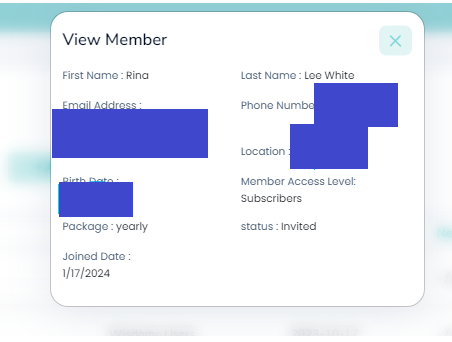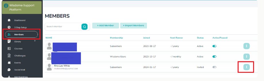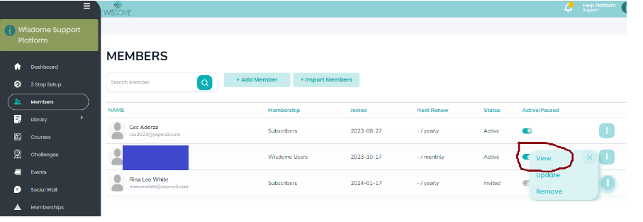 1. First click on the 'Members' menu from the upper left-hand side of your dashboard. Then, click the vertical 3-dot pop-up menu next to your members listing. Here, you can View, Update and Remove.
