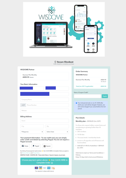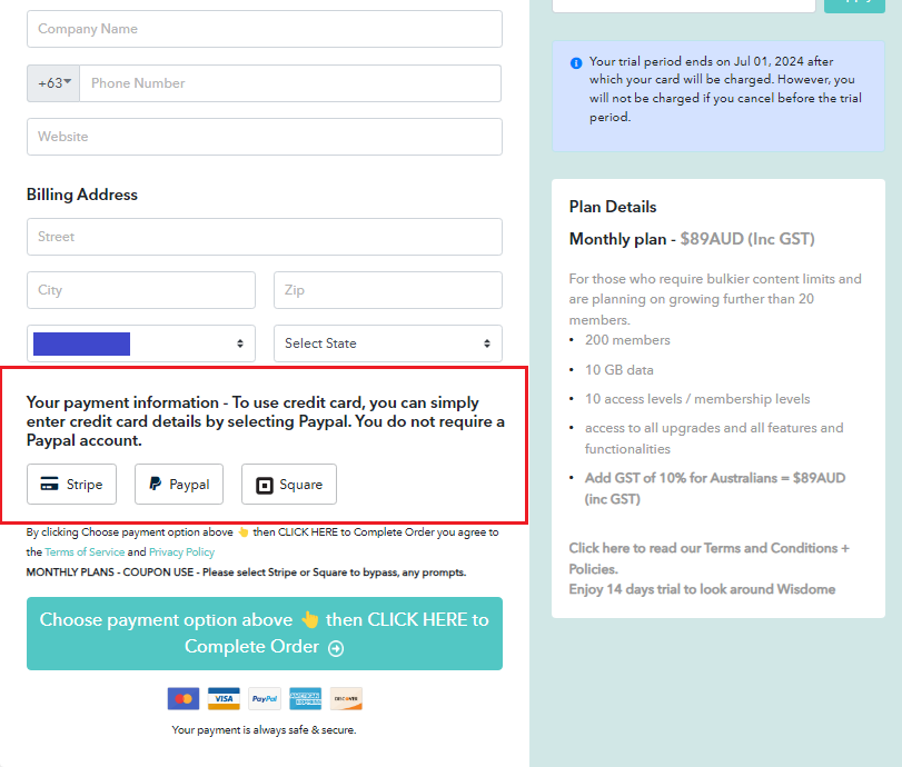 10. Choose your mode of payment (Stripe, PayPal and Square) and click 'Complete Order'.